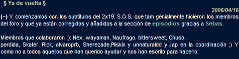Esta semana, que he tenido un poquito más de tiempo libre, he tenido la oportunidad de devolver un poquito a la comunidad de Lostzilla, y ayudar (con la colaboración de mi cari) en la traducción del episodio 2x19: S.O.S. Da gusto colaborar en proyectos así...